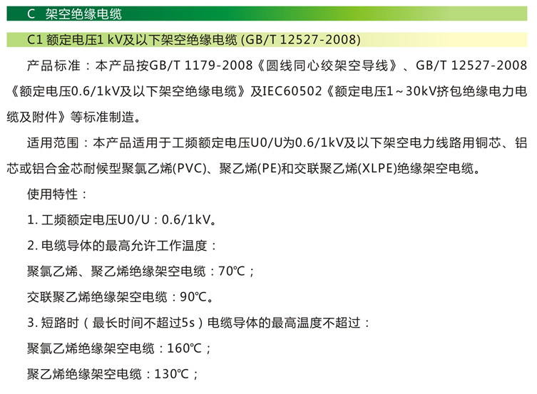 二、使用范圍 本產(chǎn)品適用于工頻額定電壓U0/U為0.6/1kv及以下架空電力線路用銅芯、鋁芯或鋁合金芯耐候型聚氯乙烯(PVC、聚乙烯(PE)和交聯(lián)聚乙烯(XLPE)絕緣架空電纜。